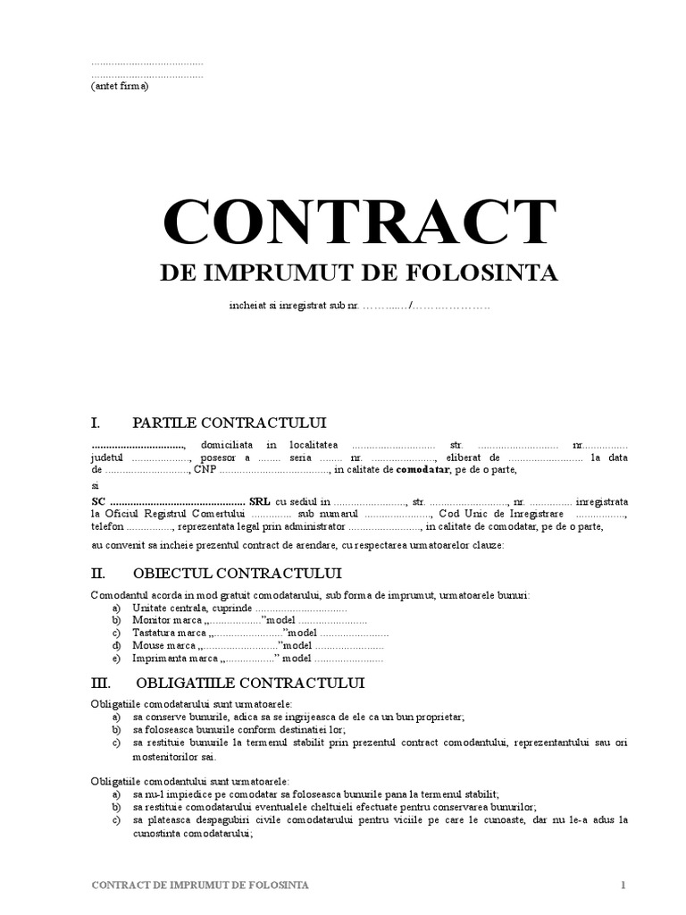 Obiectul contractului prin prezentul contract, împrumutătorul se obligă să transmită cu împrumut împrumutatului mijloace băneşti în condiţiile prevăzute de prezentul contract, iar împrumutatul se obligă să primească şi să restituie împrumutătorului: Va prezint un site web care aduna mii de. Au convenit să încheie prezentul contract de prestări de servicii, cu respectarea următoarelor clauze 4.4. Contractul de comodat apartament intre persoane fizice este un tip de contract prin care una dintre. Imprumutatorul declara ca acorda cu titlu de imprumut imprumutatului, suma euro, si este de acord cu termenul si conditiile de rambursare a imprumutului, prevazute in prezentul contract.