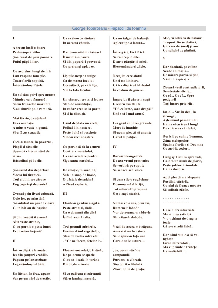 Capacitatea de comunicare si de reactie afectiva. Cauze naturale (cancer de ficat*). Peste fagi cu virfuri sure a cazut amurgul rece. Întârziată fără vreme se plimbă toamna prin grădini cu faldurii hlamidei plini de crizanteme. George topirceanu a fost un poet, prozator, memorialist și publicist roman, membru corespondent al academiei romane din 1936.