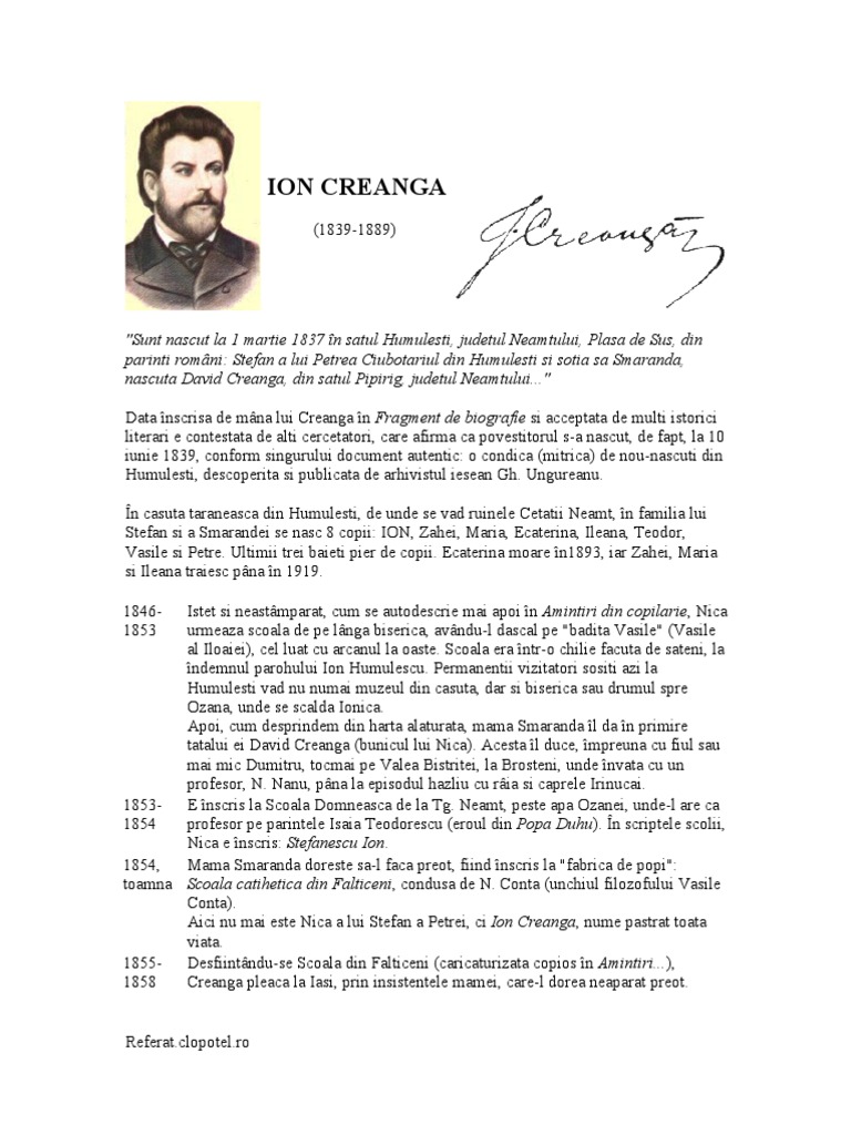Ion creangă (nascut la 1 martie 1837, humuleşti, decedat la 31 decembrie 1889, iaşi) este unul dintre clasicii literaturii române. #viatasiopera #ioncreanga #humulesti #mihaieminescu #neamt #targuneamtva rugam sa ne sustineti pentru a continua acest proiect pe. Nascut la 1 martie 1837 la humulesti ;