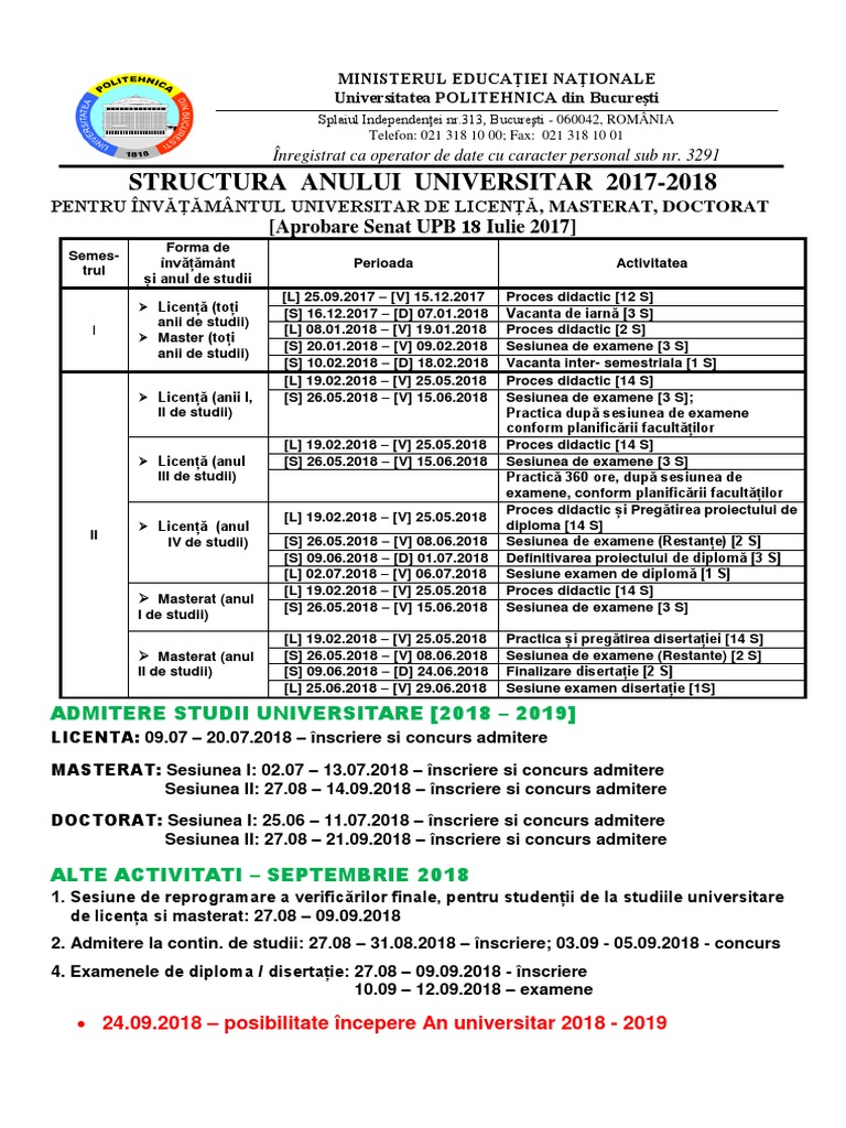 În anul școlar 2017/2018, structura anului universitar va fi același pentru învățământul superior la studii universitare de licență, master și studenții înscriși la studiile universitare de licență și master care vor trece de examene în anul i, ii, iii, iv și master vor termina cursurile pe 30 iunie 2018. Structura anului universitar la universitatea alexandru ioan cuza din iași. 17.09.15 regulament admitere studii doctorat.