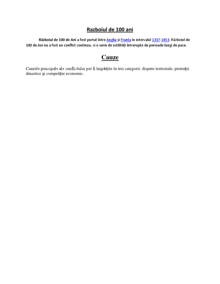 Rzboiul de 100 de ani nu a fost un conflict continuu, ci o serie de ostiliti ntrerupte de perioade lungi de pace. Cauze cauzele principale ale conflictului pot fi mprite n trei categorii: Tocmai ce am invatat la istorie si.