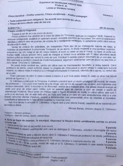 Bacalaureat 2020 a început luni, 22 iunie, cu examenul la limba și literatura română, prima probă scrisă a absolvenților liceu. Proba a fost susținută de 15 964 de candidați, dintre care 13 065 au susținut iată subiectele testului la limba română, profil umanist. Subiectele la bacalaureat, la limba și literatura română, au fost aceleași la profilul real și la profilul uman.