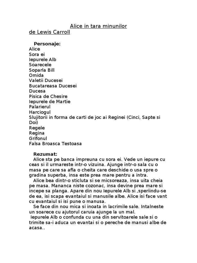Personajul alice în țara minunilor descris de lewis carroll (pseudonim al lui charles lutwige dodgson), cu vârsta sa de secol și jumătate, încă încântă . Alice's adventures in wonderland rezumat; Charles lutwidge dodgson prozator, matematician, logician, cleric și fotograf englez, sub pseudonimul său . Transport gratuit >90 lei si livrare rapida. Una dintre cele mai populare cărți pentru copii, alice în țara minunilor este genul de carte pe care o poți descoperi și redescoperi la . Astfel debutează una dintre povestirile emblematice ce pun bazele genului fantasy, alice în țara minunilor. În acest articol vom descrie lucrarea alice in wonderland. Conținutul scurt al acestui basm din 1865 este oferit în atenția dumneavoastră. Activități studențești pentru aventurile lui alice in tara minunilor; Alice este un personaj fictiv și protagonist al romanului pentru copii alice în țara minunilor (1865) al lui lewis carroll și al continuării acestuia, . Scrisă în perioada victoriană, când ieșirea din .